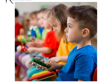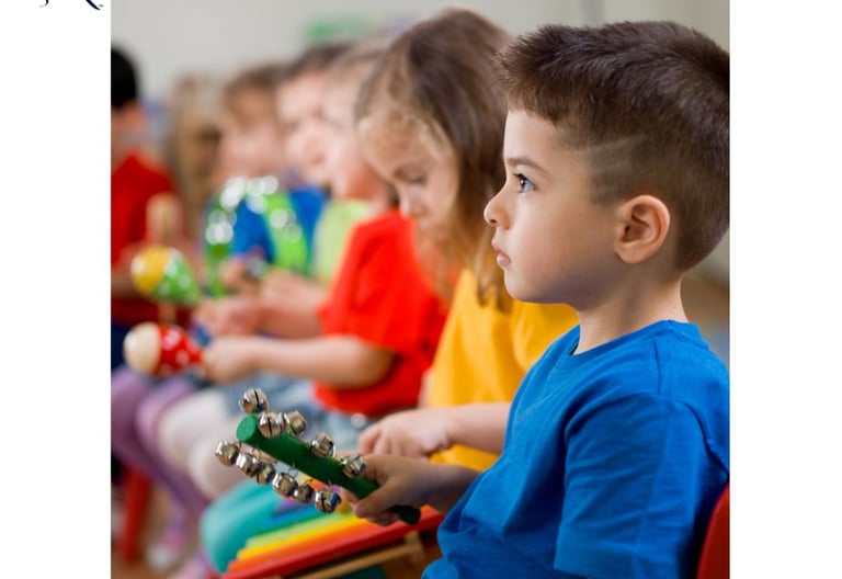 Aulas em grupo ou individual para crianças pequenas de 3 a 6 anos, e crianças maiores de 7 a 10 anos desenvolvendo habilidades musicais e sociais.